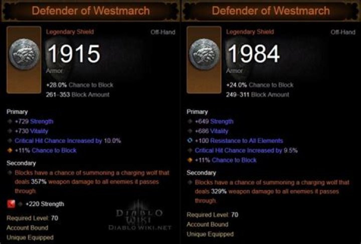 Defender of Westmarch Level: 31. Off-Hand. Legendary Shield. +16.0-26.0% Chance to Block. (236-295) – (283-413) Block Amount. Primary. +6% Chance to Block. Secondary. Blocks have a chance of summoning a charging wolf that deals 800-1000% weapon damage to all enemies it passes through.