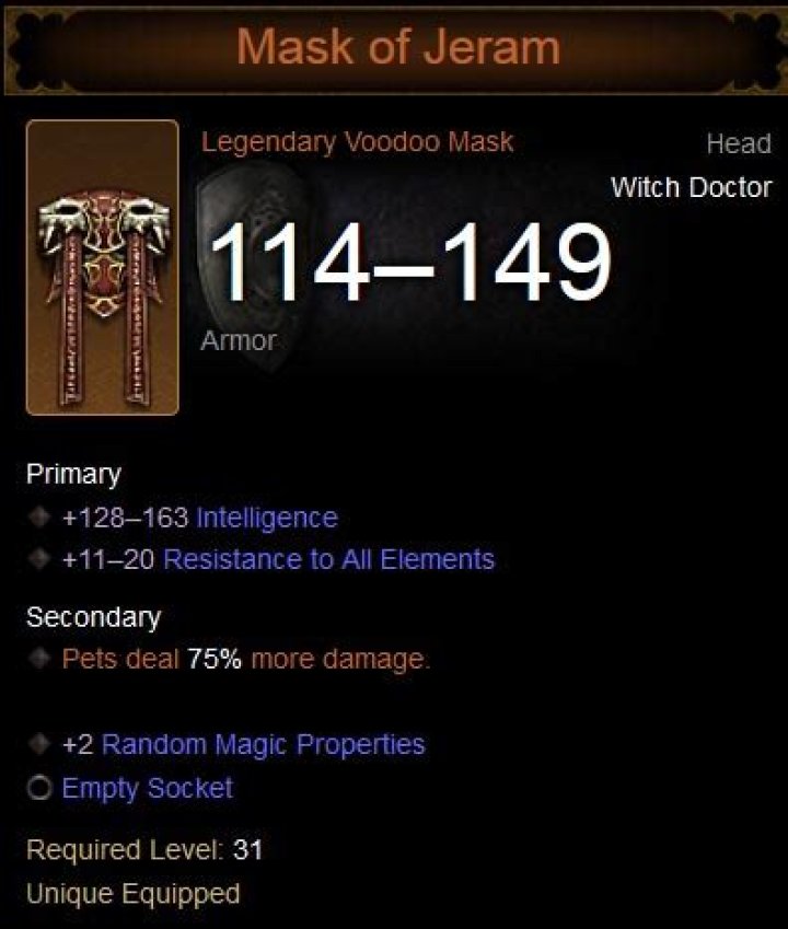 OverviewStats (Level 70)Mask of Jeram is a Legendary Voodoo Mask for the Witch Doctor in Diablo III. It requires character level 31 to drop. It is the most critical item for any Pet-oriented Witch Doctor build: combined with Zunimassa’s Haunt or Helltooth Harness, Midnight Feast, Tasker and Theo and other Pet-enhancing items and skills, it makes summoned creatures literally do all the short wo… ·