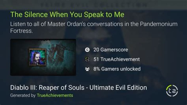 Diablo III: Reaper of Souls › The Silence When You Speak to Me. Trophies; Guides; Leaderboard; 100% Club; Platinum Club; Forum; The Silence When You Speak to Me Listen to all of Master Ordan’s conversations in the Pandemonium Fortress. 18,128 Achievers: … 3:56:52 PM: 47: KHarl43: 17 th Jun 2021 3:22:29 PM: 48: BuddyBuddinson: 17 th Jun 2021 …