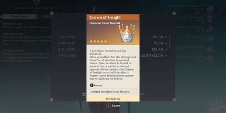 Upgrading a Talent to base Level 10 is colloquially referred to as “crowning” a talent. The Crown of Insight is a Talent Level-Up Material used when leveling Combat Talents from base Level 9 to 10. One Crown of Insight, in addition to the usual Talent Level-Up Materials, is required to upgrade one Combat Talent from base Level 9 to 1…How to ObtainGalleryCrown of Insight can be obtained through Offerings or rewards from Limited Time Events. A total of 18 Crowns of Insight have been obtainable since the launch of the game. Currently Obtainable 6 Crowns of Insight are permanently obtainable through Offerings: 1× from upgrading the Frostb… · Văn bản trong giấy phép CC-BY-SA