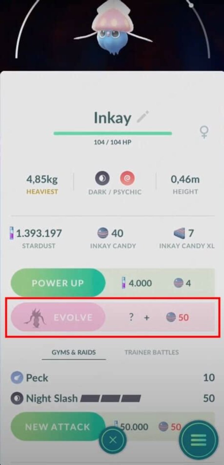 In order to evolve Inkay into Malamar, players will need 50 Inkay candies and then tap the Evolve button while holding their phone upside down.