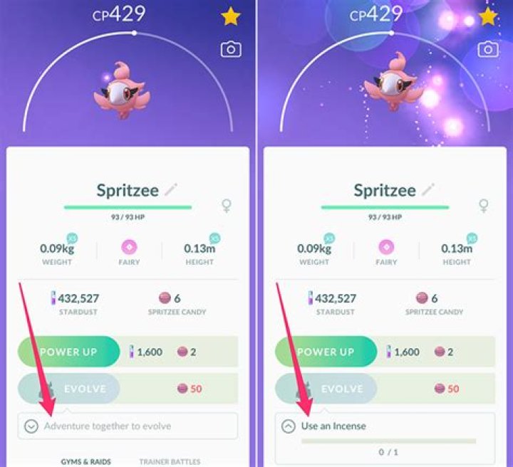 You’ll need 50 Spritzee candies to evolve it, so once you have enough, you can start the evolution process, which goes as follows: Make Spritzee your buddy. While it’s your buddy, activate an Incense from your inventory. Head back to the Pokemon page for your Spritzee and evolve it into Aromatisse.