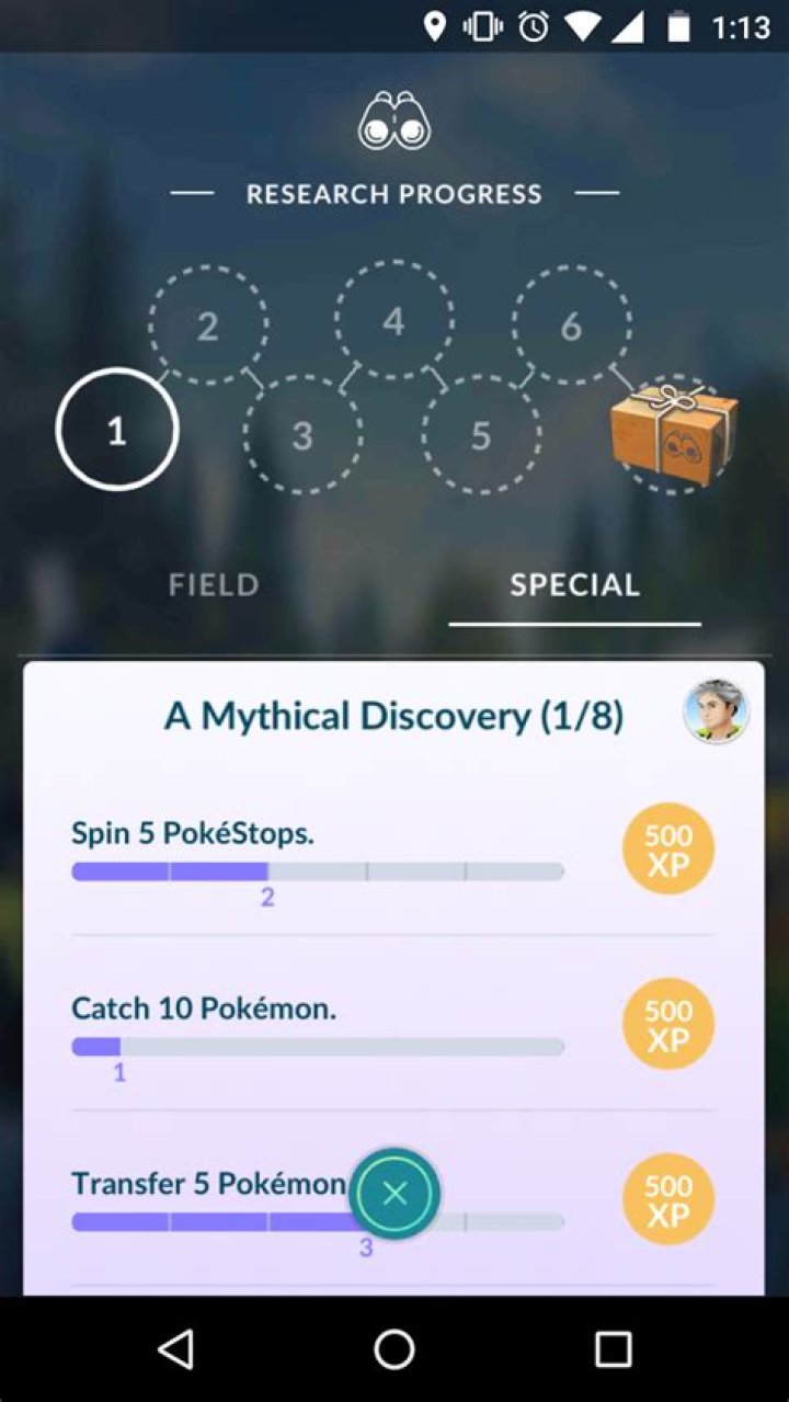 And Mew phases in and out of an invisibility cloak. Mew never appears to run, though. So, just take your time, hit it, and you’ll catch it eventually. What are the stages of Mythical Discovery and how do you finish them fast? Mythical Discovery consists of eight sections with three tasks each. This one is just the basics.