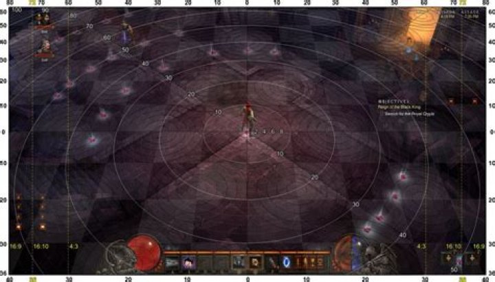 Here is an awesome visualization of the distances, courtesy of diablo.incgamers.com. Note the dashed lines that indicate different display ratios. So 10 yards gives you a radius about the height of your character, while 40 yards gives a circle that reaches just about to the edge of a 4:3 screen (note that you can see further in front of you than you …