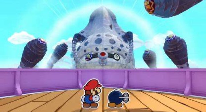 A Blooper appears as the second required boss in Paper Mario: The Thousand-Year Door. This Blooper’s tentacles are blocking the way to Petal Meadows and Mario has to hit its visible tentacle with his Hammer or jump on it. This makes the Blooper angry, causing it to attack Mario.