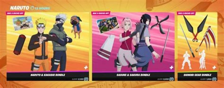Naruto Skin – 1500 V-Bucks; Kakashi Skin – 1500 V-Bucks; Sasuke Skin – 1600 V-Bucks; Sakura Skin – 1500 V-Bucks; Naruto & Kakashi Bundle – 2,100 V-Bucks