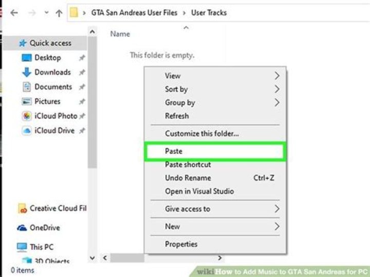 When you are done copying all of the music you want to play while you are playing GTA, paste the music into the User Track Folder in the GTA San Andreas User Folder. IMPORTANT OR THE MUSIC WONβT PLAY!!!!!ββ> when you are in Main Menu in GTA San Andreas, go to options, audio options, and go to complete scan. If you donβt do this step, you β¦