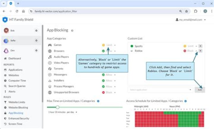 To block the Roblox app, in the main window, click Add App, select Roblox and click Add. Now Roblox is blocked permanently unless you unblock it.