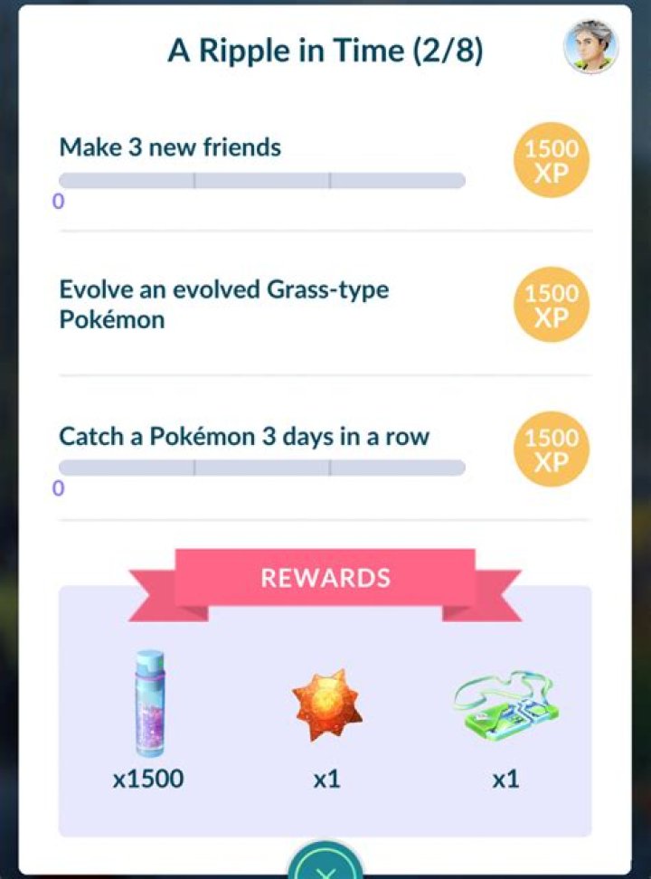 Pokemon GO Celebi quest: A Ripple in Time 6/8. Visit PokeStops 7 days in a row (3500XP) Use 25 Pinap Berries while catching Pokemon (3500XP) Use items to evolve Pokemon 2 times (3500XP)
