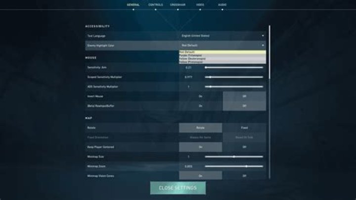 Valorant Settings to Change Highlight Color for Enemy advertisement advertisement Launch Valorant and click on the menu on the left side. Go to Settings and click on General Settings. Under the Accessibility, section look for Enemy Highlight Color. You have four options to pick, they are listed below. Red Purple – Tritanopia Yellow – Deuteranopia