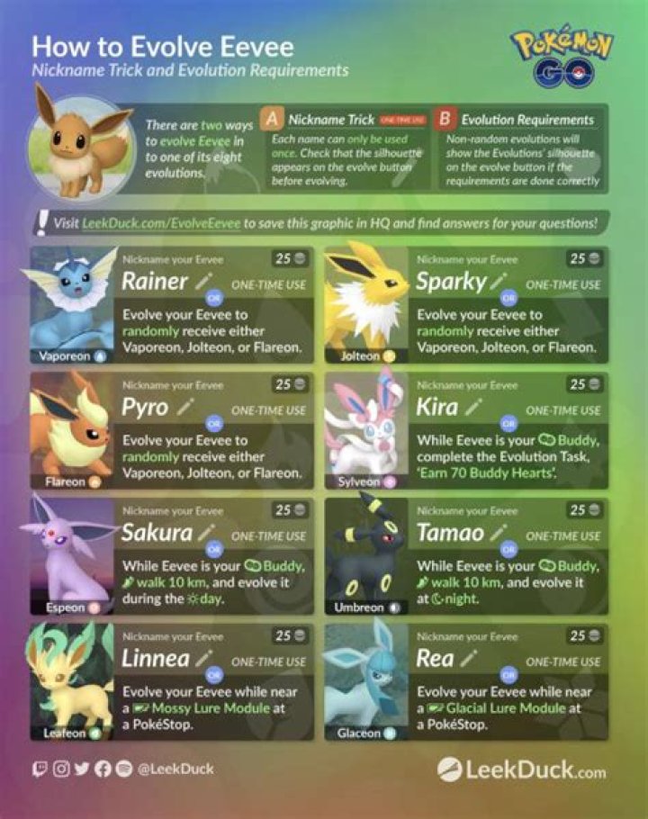 The first step is to open the menu and select the Eevee that you plan to evolve (probably the one with the highest CP). Click the edit button next to Eevee’s name and change it to the appropriate nickname… Sparky = Jolteon Rainer = Vaporeon Pyro = Flareon Be sure to match the name character for character and capitalize the first le…Restart The GameEvolveAfter renaming Eevee and saving, close the game all the way and then restart it. This is an optional step, but because the servers are still unstable, we recommend restarting to make sure that the name change stuck. A few Reddit users reported that the evolution trick didn’t work, but …