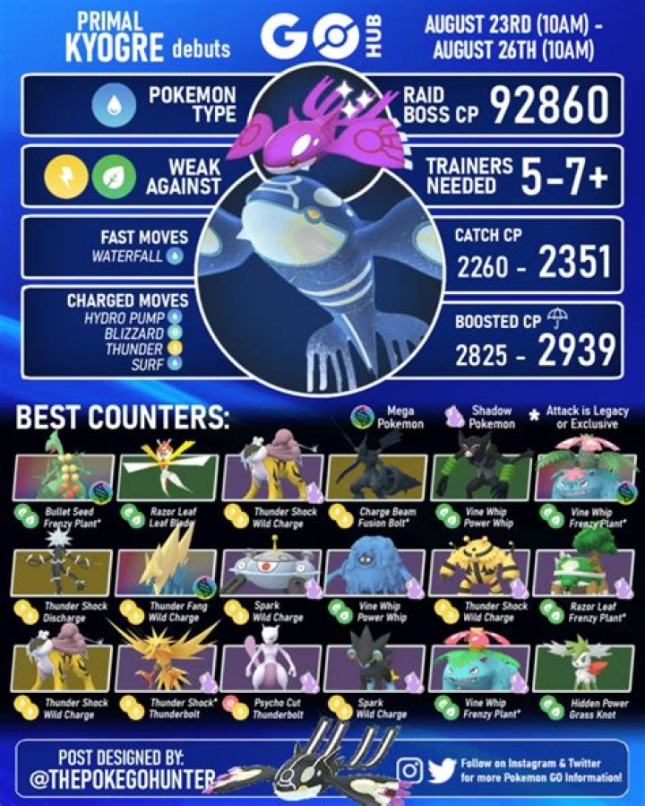 Electric-Types Are KingOther Potential CountersWeatherRaid Group SizeAs a pure Water-Type Pokemon, Kyogre is only weak to Grass and Electric-Type attacks. Unfortunately, there’s a 33% chance that Kyogre will have Blizzard as its charge move, which will wipe out a lot of Grass-Type Pokemon in just one hit. That means that you’ll want to lean on Electric-Type Pokemon to fight Kyogre. Raikou is the best counter for Kyogre, especially when a…