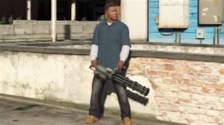 The Minigun positioned on the side of the Annihilator in Grand Theft Auto IV. Huang Lee using a Minigun in Grand Theft Auto: Chinatown Wars. The Minigun as seen in a GTA V official trailer. Vehicle-mounted variation seen in the Valkyrie and Valkyrie MOD.0, with a flash hider, iron sight and spade grips.