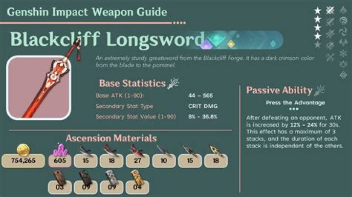 Blackcliff Pole: 42 (510) CRIT DMG 12% (55.1%) Press the Advantage After defeating an opponent, ATK is increased by 12~24% for 30s. This effect has a maximum of 3 stacks, and the duration of each stack is independent of the others. Blackcliff Agate: 42 (510) CRIT DMG 12% (55.1%) Press the Advantage