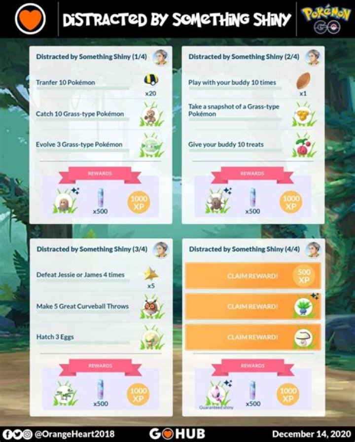 ‘Distracted by Something Shiny’ Step 1 of 4 Transfer 10 Pokémon – x20 Ultra Balls Catch 10 Grass-type Pokémon – Nuzleaf encounter Evolve 3 Grass-type Pokémon – Cottonee Rewards: 500 Stardust, 1000…