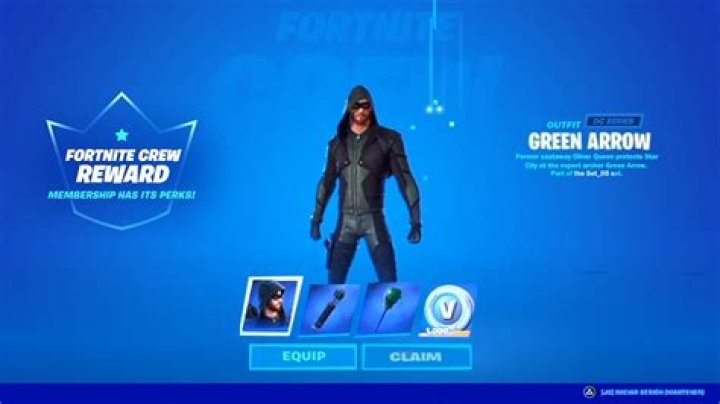 Green Arrow arrives exclusively for all Fortnite Crew members on December 31st at 7 PM ET. Important : To claim the January Crew Pack, you may need to login from your original purchasing platform if it has been more than 30 days since last login from that platform.