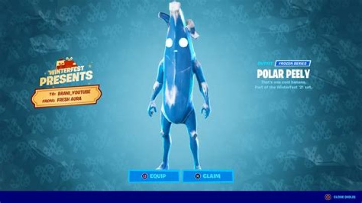 Similar to the Krisabelle skin, the Polar Peely skin in Fortnite is also available as a part of the Fortnite Winterfest 2021 rewards. Simply login everyday starting December 16th through January 6th to unlock a new gift each day. The Polar Peely skin in Fortnite will be inside the blue-colored present box wrapped with yellow ribbon.