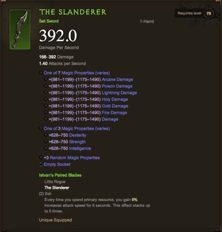 The set is comprised of two one-handed swords, Little Rogue and The Slanderer and can be equipped by any class, though only dual-wielded by Monks and Barbarians. These items drop as loot, and are not crafted via the Blacksmith or Jeweler . Required Level: 70 Istavan’s Paired Blades Set Pieces Set Bonuses