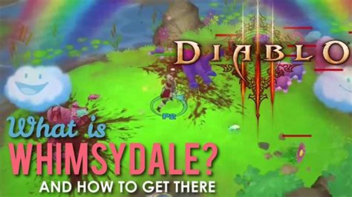 How do you get to Whimsydale in Diablo 3? Whimsydale is a unique location in Diablo III that can only be accessed by killing a Rainbow Goblin. It uses the Whimsyshire tileset, and is overall identical to it. This location was added in patch 2.1. This zone can spawn all the same Unique Monsters as Whimsyshire, with the exception of Sir William.