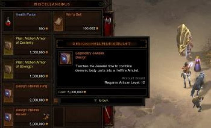 The crafting plan can be acquired from Squirt the Peddler in Act II for 5 million gold. To make a Hellfire Amulet, one will need all the same materials as those for the level 70 Hellfire Ring (50,000 gold, Heart of Evil, Vial of Putridness, Leoric’s Regret, Idol of Terror ), plus 10 Forgotten Souls .