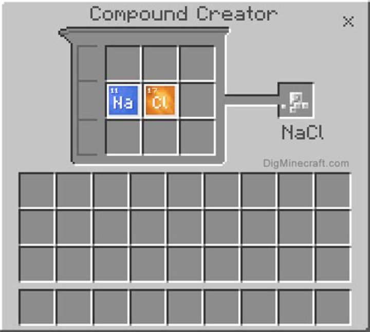 To make Salt, place 1 Sodium and 1 Chlorine in the 3×3 grid. When crafting Salt, you can place the elements anywhere in the grid and you will get the same result. In this example, we have placed 1 Sodium and 1 Chlorine in the second row. This is the Minecraft crafting recipe for the compound called Salt which has the chemical formula of NaCl.