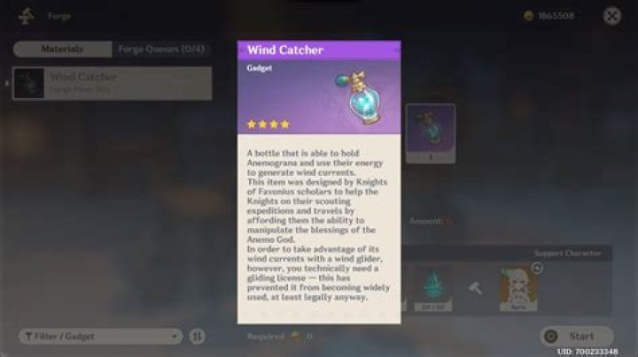 To get the Genshin Impact Wind Catcher, you have to reach level 3 at the Reputation Vendor in Mondstadt. After you do that, you can pick up the crafting recipe for the item. Once you have it, head to the blacksmith nearby, and ask him to make you something. Go to Gadgets, and select the Wind Catcher.