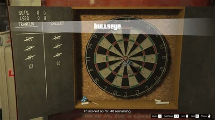 Darts is an interactive game that can be played at the Yellow Jack Inn at Sandy Shores. Darts can be played by any of the three protagonists. Darts can either be played whilst hanging out with another character, or by yourself. When playing by yourself, an NPC will be your opponent.