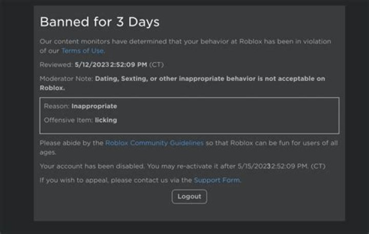 When someone receives a 14-day ban, the moderator note might state that their account has been terminated, even though it has not. In September 2020, the ban notice was redesigned to support dark mode. The Robux balance now displays as “?” for a banned user. Roblox moderates accounts based on international law.