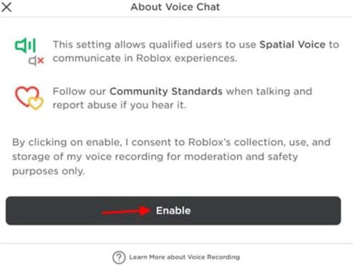 To enable the Spatial Voice feature, follow the instructions below: Go to Account Settings. Complete Age Verification. Select the Privacy Tab. Toggle the Spatial Voice selector to ON. The toggle will turn from grey to green, indicating that voice chat has been enabled for your account.