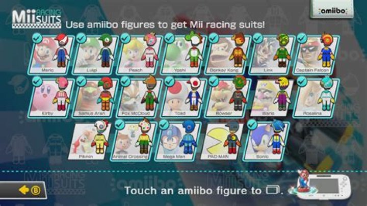 Here is every Mii racing suit costume you can unlock in Mario Kart 8 on both Wii U and Switch: Mario Kart 8 Deluxe amiibo list. Here is a list of every supported amiibo in Mario Kart 8 Deluxe by Mii racing suit. Note certain amiibo and one Mii racing suit works on Switch, and you only need to tap one amiibo per racing suit to unlock it for good.