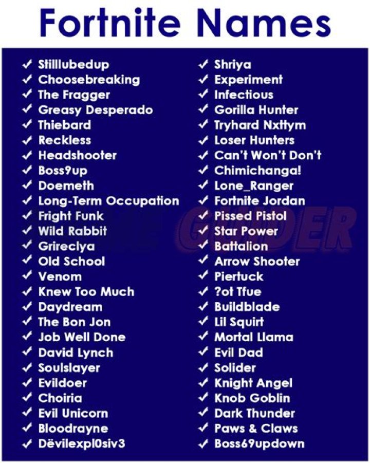 515+ Best Fortnite Names Cool, Good, Funny, Epic (not taken) We are going to share Fortnite names huge list for your Fortnite gaming profile. guys are you searching for so catchy gaming name for your profile then your wait is our we have some good Fortnite names. From this list, you can take anyoneโs name for your Fortnite user-id and use them our โฆ