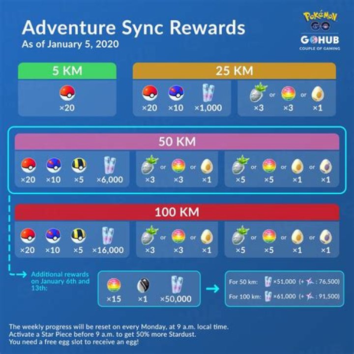 Pokemon Go Weekly Adventure Sync Rewards for Walking 5KM, 25KM, 50KM and 100KM. A feature in Pokemon GO called Adventure Sync was implemented in Version 1.93.1, back in 2018. This is a feature that will keep track of your movement progress and will also give you weekly rewards based on your walking distance.