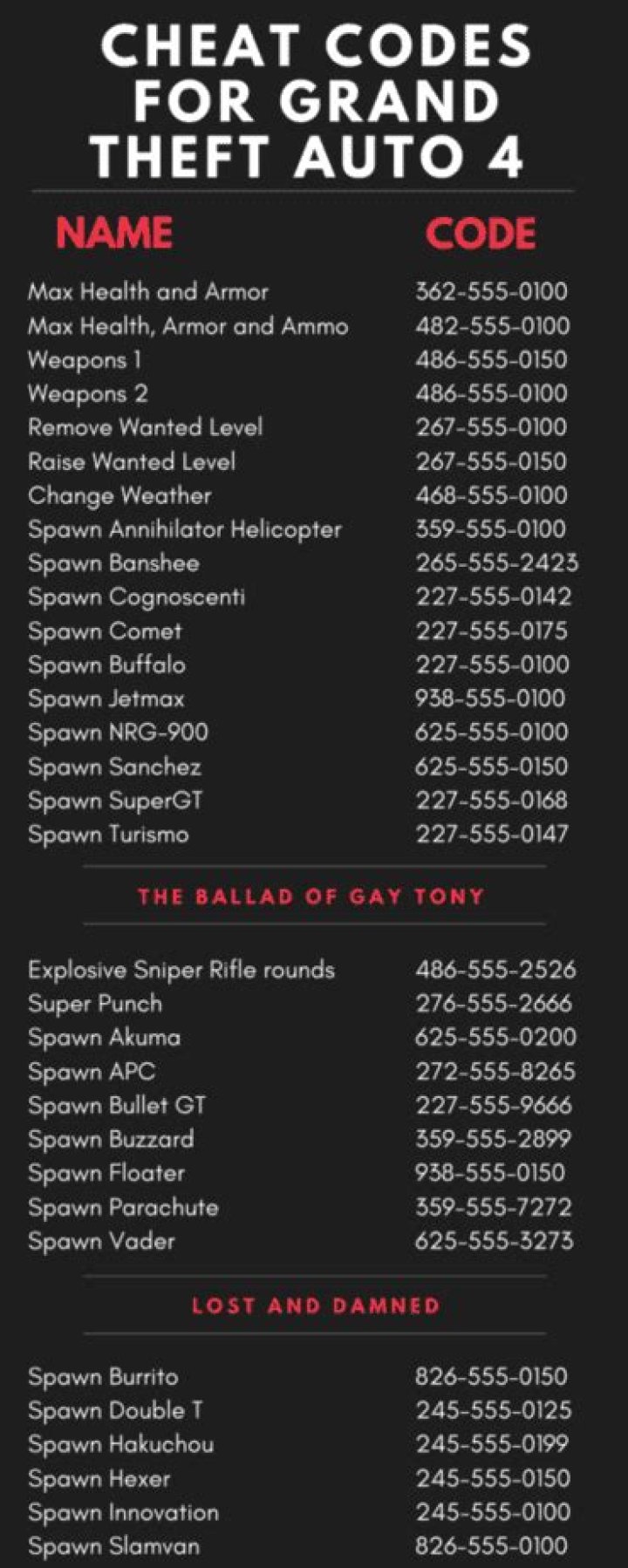 Cheat Name: Cheat Code: Health & Weapons Give Niko health and weapons. 482-555-0100: Health & Armour Give Niko health and armour. Blocks the achievement “Finish Him.” 362-555-0100: Weapons (Advanced) Baseball Bat, Grenades, Combat Pistol, Combat Shotgun, SMG, Carbine Rifle, Combat Sniper, RPG. 486-555-0100: Weapons (Poor)