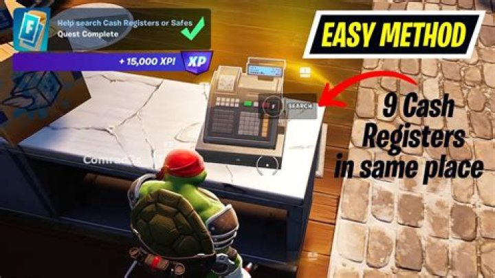 Stage 1 – Open a cash register (12,000 XP) Cash registers in Fortnite are pretty abundant so to speak. Their spawn rate is unknown but then again, they spawn throughout all commercial buildings on the island. All you need to do is head inside one of these buildings and interact with the cash registers at the counter.