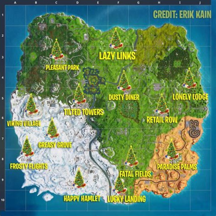 Here’s where they are on the grand world map: Fortnite. Epic. To recap, we have: A holiday tree in the middle of Pleasant Park. A holiday tree in the north of Holly Hedges. A holiday tree in the middle of the unnamed orchard northeast of the desert. A holiday tree at the west side of Salty Towers. A holiday tree at the north end of Dirty Docks.Is Accessible For Free: FalseRelated Questions