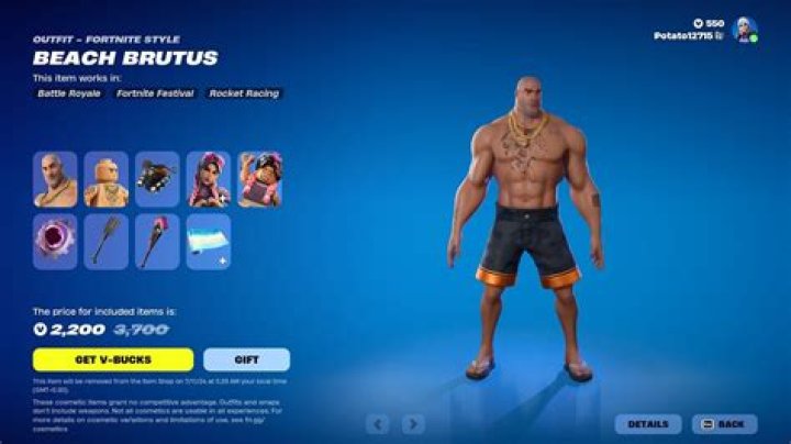 OverviewItem Shop Appearances“ Show off that beach bodyguard. ” — In-Game Description Beach Brutus is a Rare Outfit in Fortnite: Battle Royale, that can be purchased in the Item Shop for 1,300 V-Bucks. He was first released in Chapter 2: Season 7 and is part of the Undercover Summer Set. · Văn bản trong giấy phép CC-BY-SA
