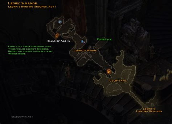 From there you can enter Leoric’s Manor Courtyard on the left side of the map. Inside that same courtyard you will find the entrance to Leoric’s Manor. Check the fireplace for the burnt logs, if they have spawned click on them and you’ll get your shinbone.
