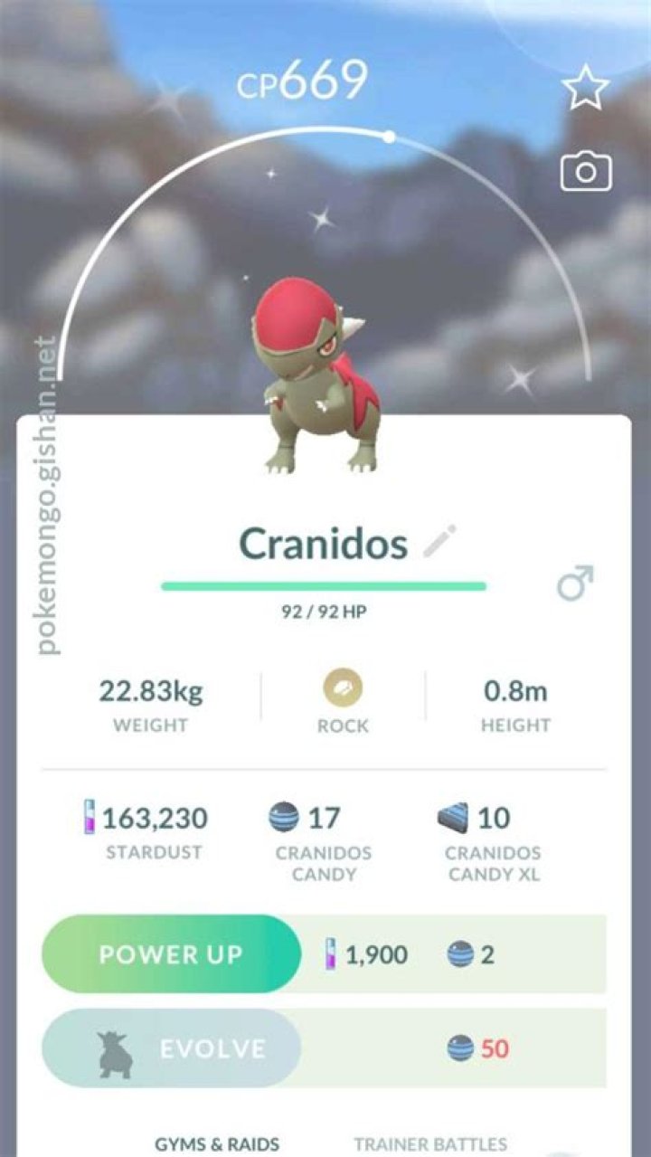 Cranidos is a Rock Pokémon. It is vulnerable to Fighting, Ground, Steel, Water and Grass moves. Cranidos’s strongest moveset is Zen Headbutt & Ancient Power and it has a Max CP of 1,820. Cranidos evolves into Rampardos. About “Its hard skull is its distinguishing feature. It snapped trees by headbutting them, and then it fed on their ripe berries.”