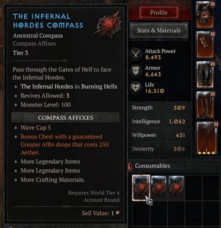 The minimum level this item can drop at is 60. Below you will find the range of stats found on the level 60 version, however the item can drop at any level above 60. The legendary effect does not change with level. One of 3 Magic Properties (varies) +220–349 Strength +220–349 Dexterity +220–349 Intelligence +4 Random Magic Properties