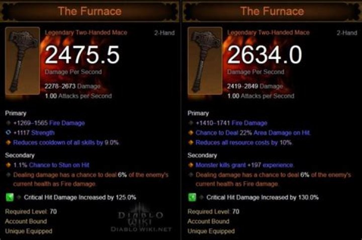The Furnace. The Furnace is a legendary two-handed mace that can be found in Diablo 3 and Reaper of Souls. This item can be found and equipped by any class. The Smart Drop system ensures that this weapon will usually roll with the mainstat appropriate to the class that finds it.