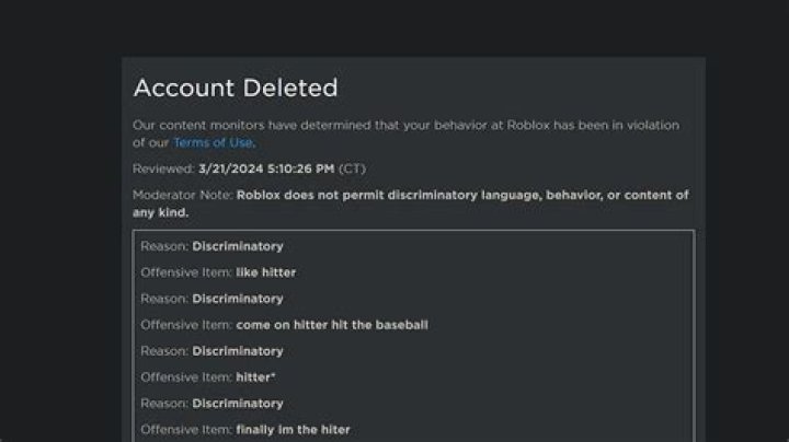 An account deletion will also be given away if asked by the owner of the account with the moderation note: “Your account has been deleted as per your request. Thank you for being a part of the ROBLOX community.” This feature was removed due to people impersonating owners of different accounts, writing fake requests for account deletion.