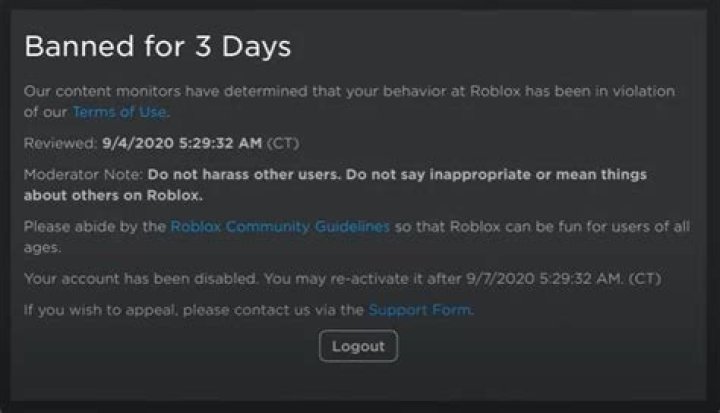 3-day ban The player’s account is banned from using Roblox for three days (72 hours). The new three-day ban. Banned for three days in Spanish. English Translation: This content is not appropriate. Hate speech is not permitted on Roblox./ This content is not appropriate. Hate images are not permitted on Roblox. Banned for three days.